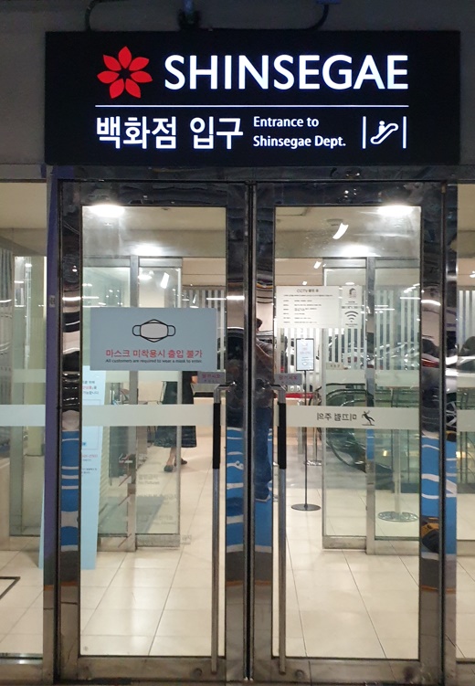 영어로 SHINSEGE로 쓰여있는 신세계백화점 건물이 보입니다.