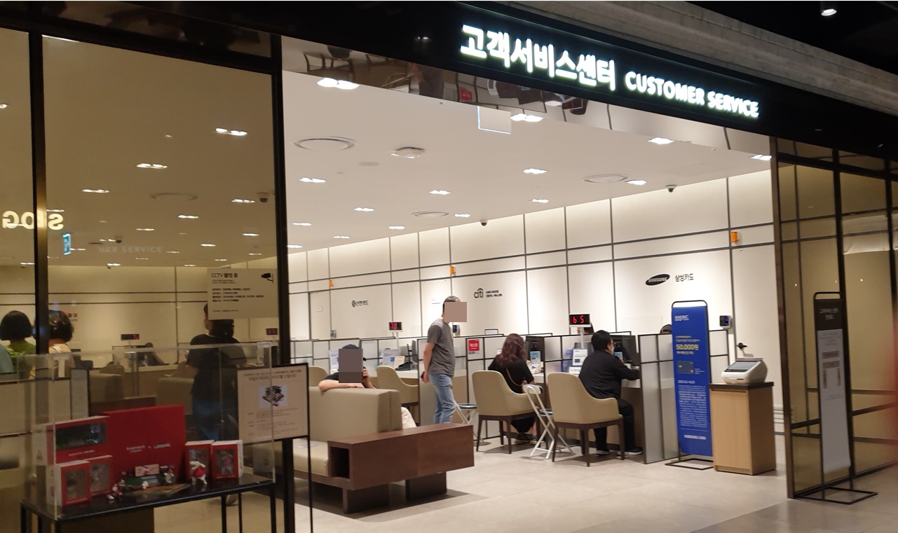 고객센터에 들어가면 오른쪽은 삼성카드 관련, 왼쪽은 신세계포인트 관련 업무를 보는 곳이고, 정면 안쪽에 안내창구에서 모바일 상품권을 보여주고 교환하면 됩니다.